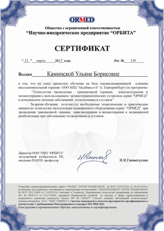 Преимущества: Добрый день! В клинике обратилась из-за сковывающей боли в шейно-грудном отделе позвоночника и постоянных головных болей (мигрень) по несколько раз в неделю в связи с чем постоянно приходилось пить сильные обезболивающие препараты. Была на первичном приеме у доктора Каминской Ульяны Борисовны. Идеально внимательный врач - собрала полный анамнез, внимательно и обстоятельно каждый прием отслеживала динамику, корректировала назначения. Все объясняет, отвечает на все вопросы. Я прошла в клинике пять сеансов лечения на протяжении примерно 3 недель. За это время существенно улучшилась ситуация с моим остеохондрозом шейно-грудного отдела и самое главное я не разу за этот период не пила обезболивающих препаратов! На фоне того, что само лечение абсолютно без медикаментозное это для меня отличный результат. Рекомендую клинику и спасибо доктору!